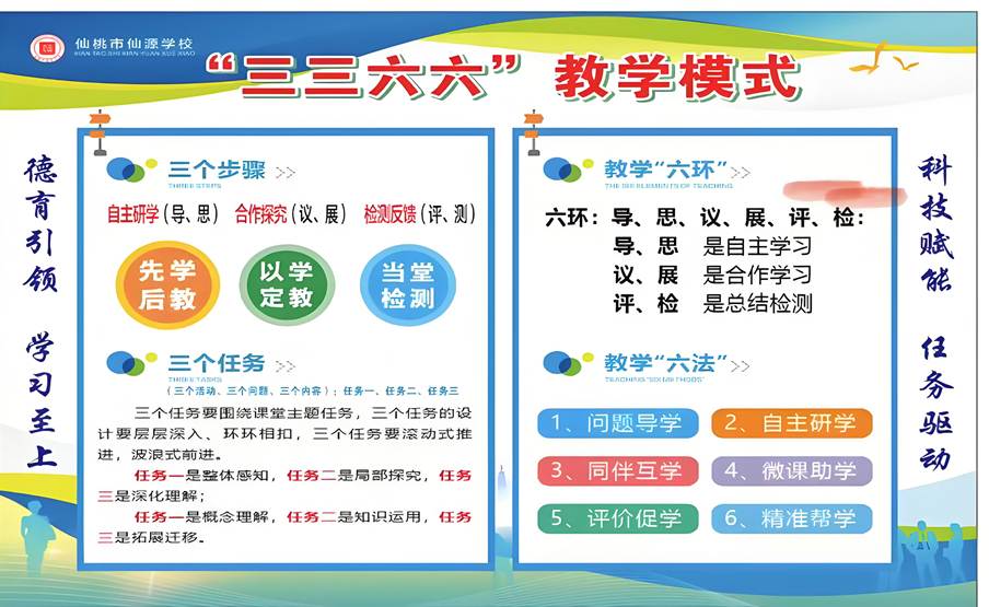 第2个6即教学6法,自主研学、同伴互学、问题导学、微课助学、以评助学、精准帮学。